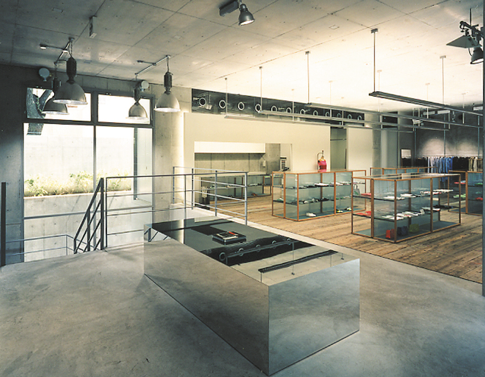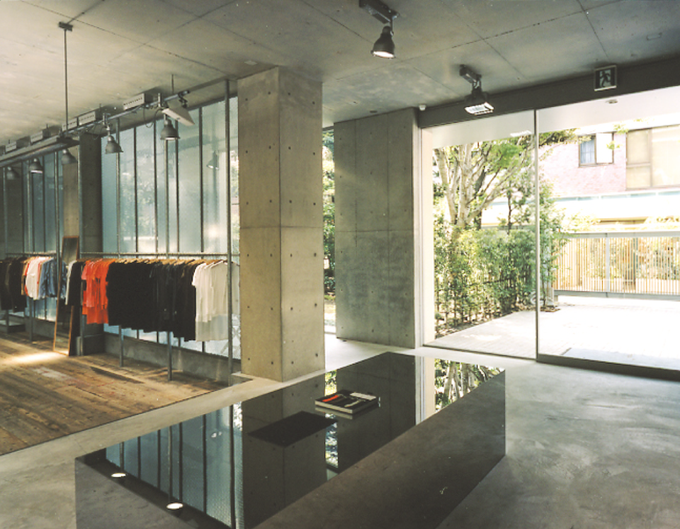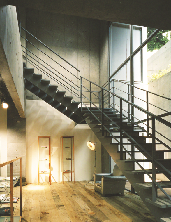 その自然を残しつつ2世帯住宅と商業施設の複合ビルとして、計画・建築することとされました。庭の木々を切る事なく住居のプライベートを確保し、商業施設としての導線的なアプローチを両立させることが求められました。店舗はファサードを半分開きつつ内部空間が豊かな構成になるように、ドライエリアからの光の導入や階段周りの吹抜けを設けています。