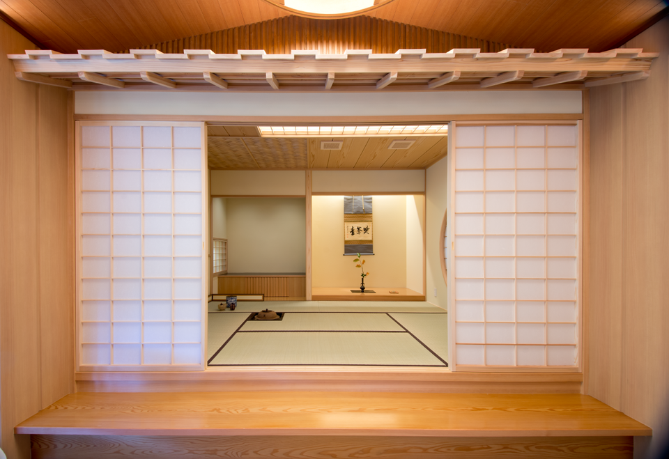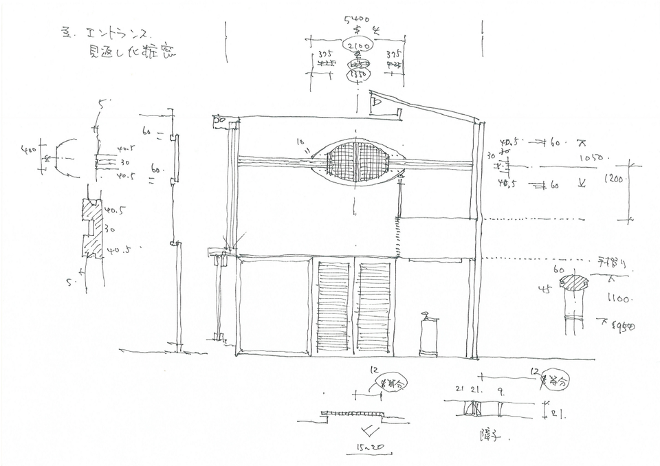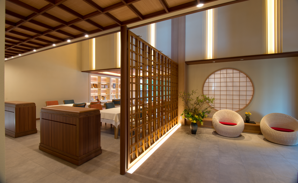 レストラン「やまもも」は、その中にあって庭全体が『白い花しか咲かない特別な空間』を提供したいと考えました。白は、心からの尊敬・無邪気・清純・純潔・恋の吐息・相思相愛・尊敬・素朴といった、花言葉にも連想されるように心を若々しくしてくれる色だからです。そんなホワイトガーデンの中に数奇屋風の外観を持った、和モダンの建築デザインを基本に計画しました。茶室を併せ持つ和のイメージの空間の中にあって、本格的なフレンチレストランとなっています。