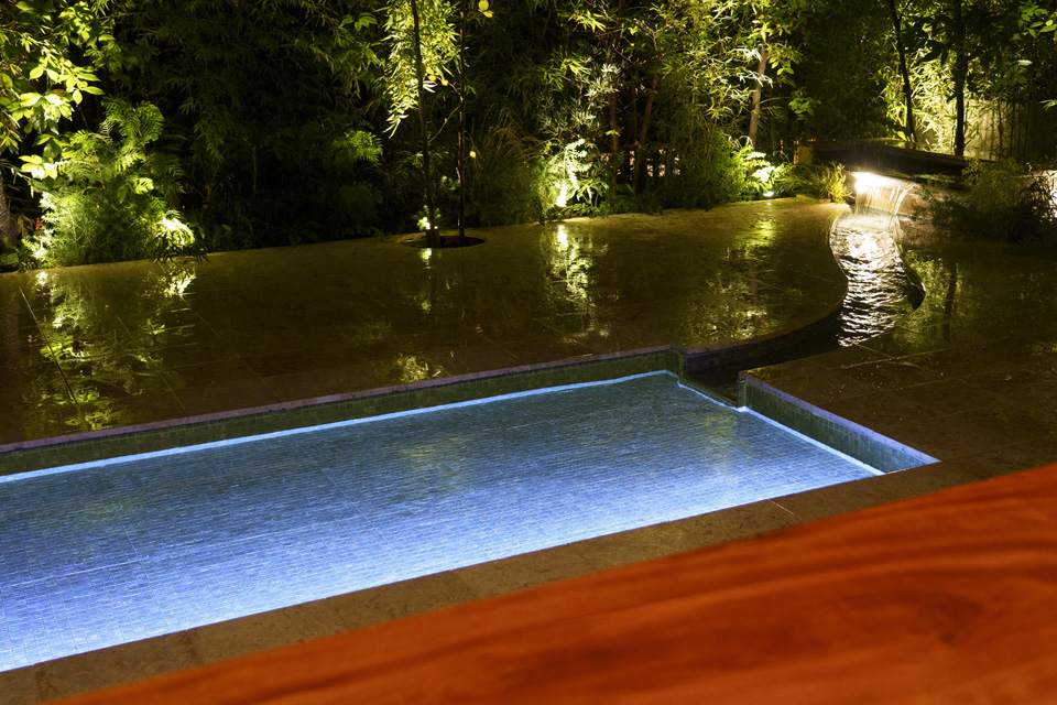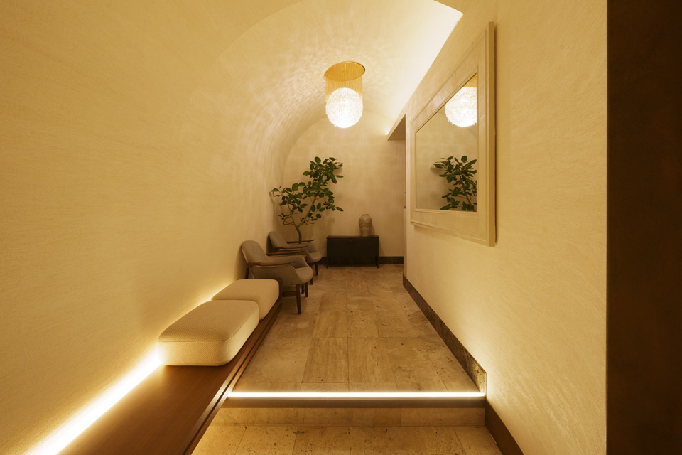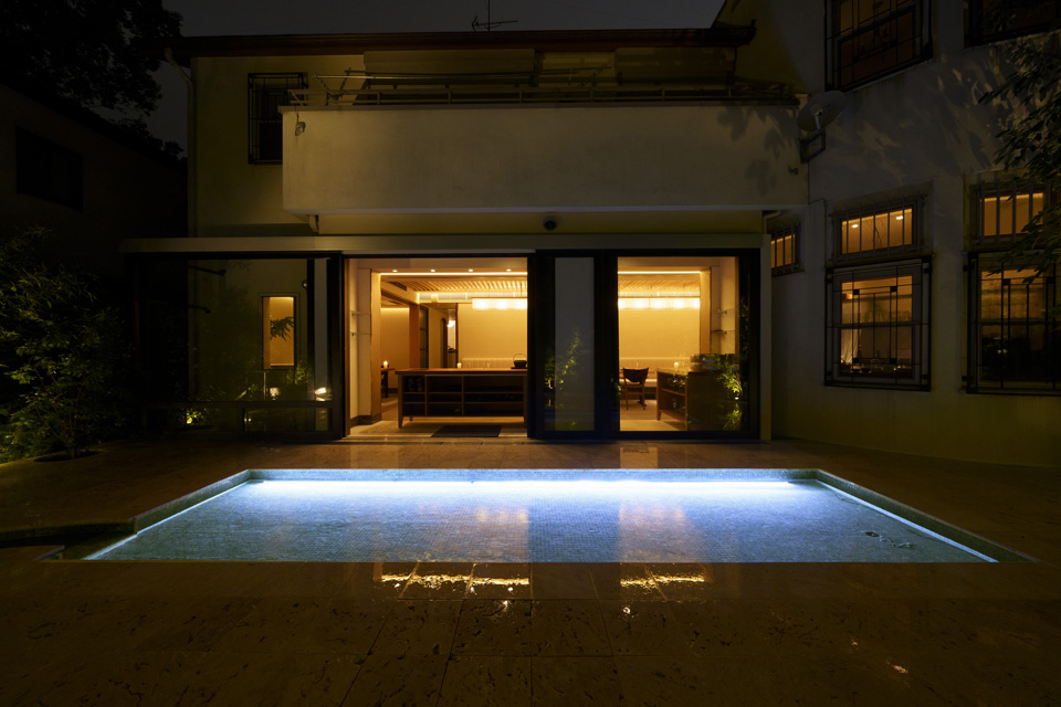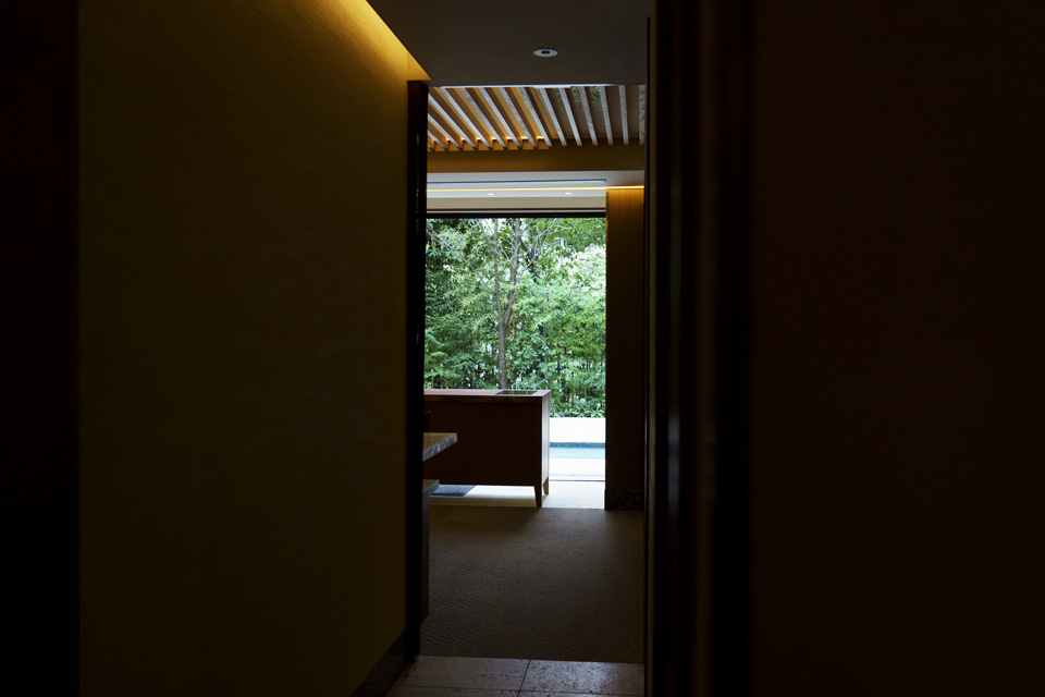 南平台のゆたかな緑と古き良き建築群の中にあって、ひときわひっそりとした住宅街の中のレストラン。路地から和と洋を融合した緑と格子のトンネルを潜ってエントランスへ向かい、日常からゆっくりと非日常の世界(ガーデンレストラン)へトリップするように導かれます。 都心にいながらにして、路地を入ると、和洋折衷の落ちついた内装デザインと緑豊かな中庭に落水する水辺のある水盤とテラスは、リゾート地と見紛うようなあらたな発見と驚きの物語へと誘われます。
