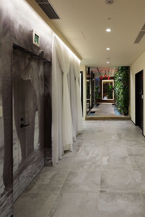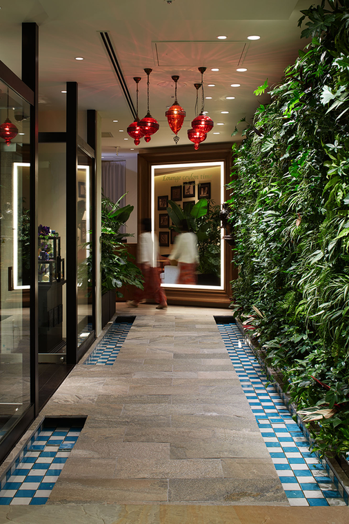 現実の時間に追われる日常からEVを降りると大自然の写真で自然を疑似体感できます。壁面緑化された水路を通り抜けると、ゆたかな自然の空気感と心地よさを感じさせます。