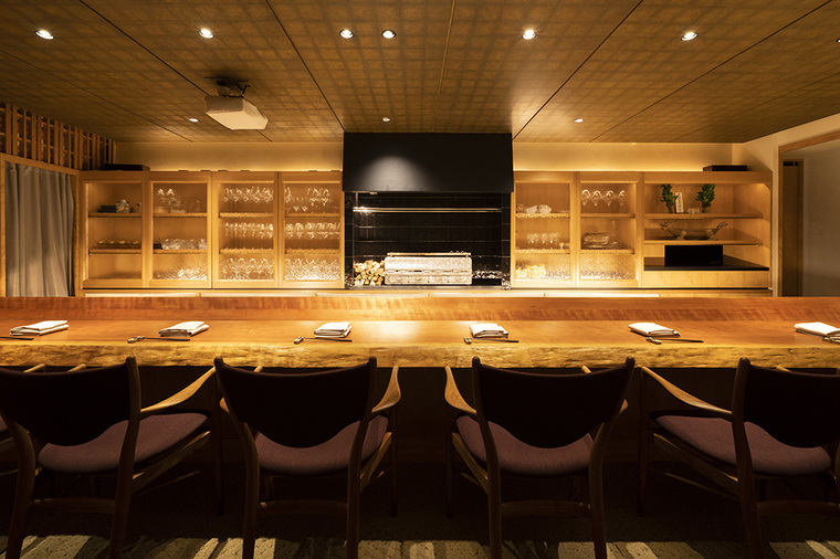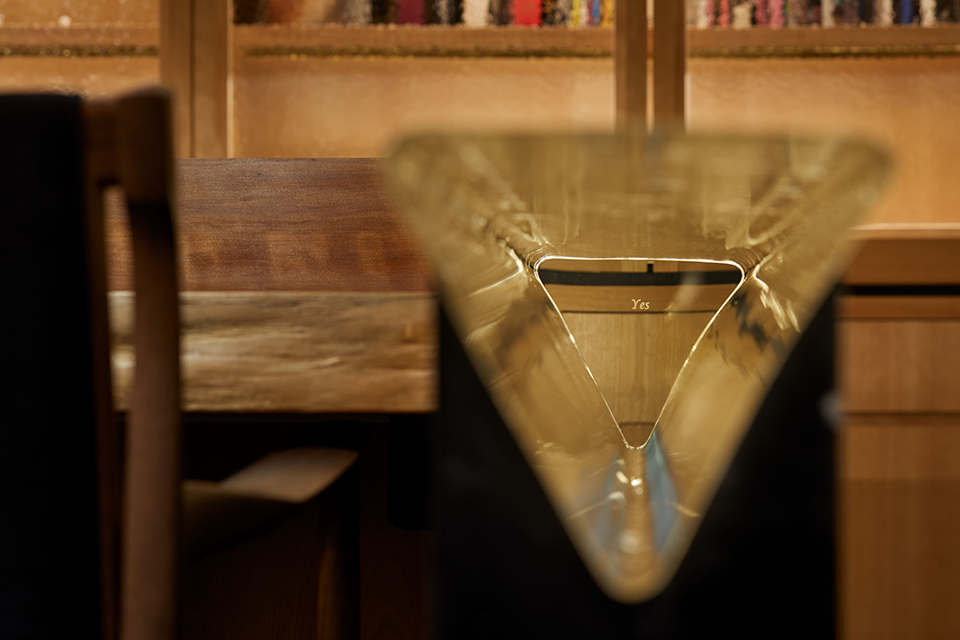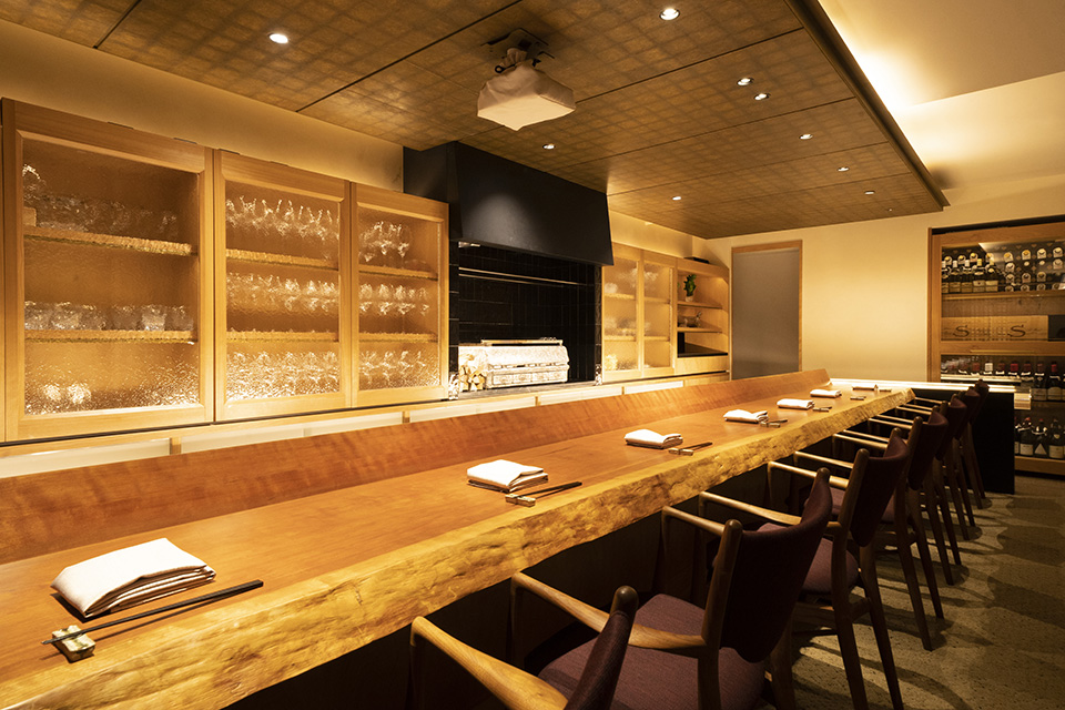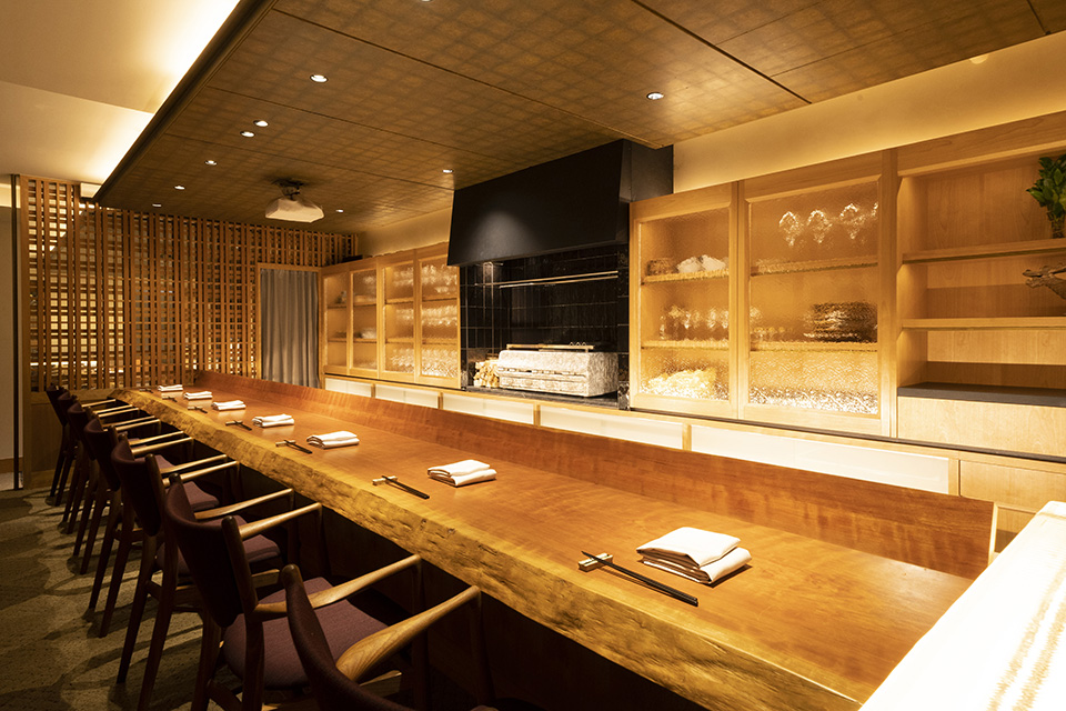 散りばめられた複数の素材、特殊ガラス、真鍮素材などのデザイン、分厚い一枚板のカウンター、選び抜かれた飾り物、そのオーセンティックな空間で心地よく過ごす場を提供します。