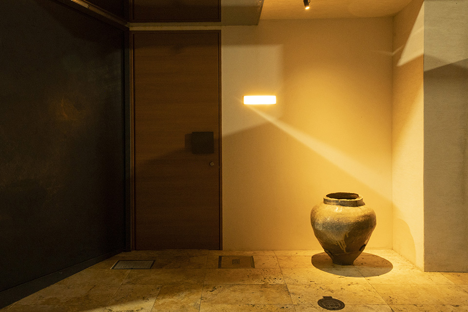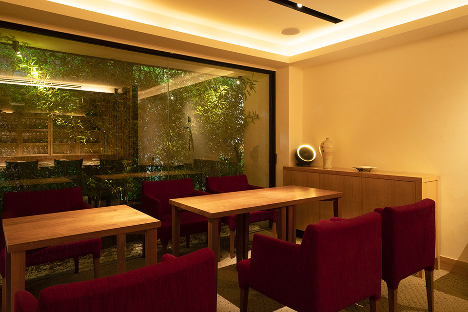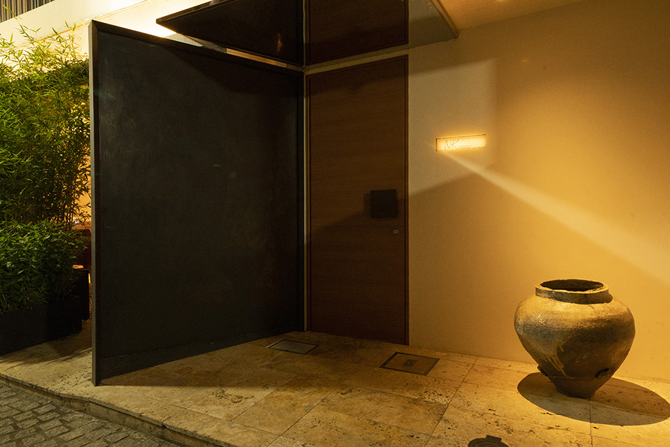 神楽坂の古き良き神社の近くにあって、ひときわひっそりとした路地裏に佇む、至福の時間を愉しめるあたらしい和の空間です。路地から外観が垣間見える植栽とオブジェをすり抜けて木の扉を開け、日常からゆっくりと非日常の世界へトリップするように導かれます。