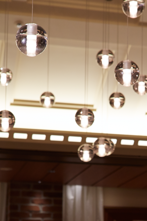 内部空間は、ボールト天井に依って包まれるような穏やかな空間となっています。そして、アトランダムに吊られた涙型のボール球ランプなどによってゆらぎをイメージした居心地の良い空気感を演出しています。