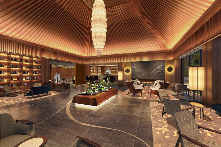 富士山を正面に対峙する形でホテルが配置されています。ロビー空間は日本の伝統的な和モダンをベースにした方行の天井で構成されています。