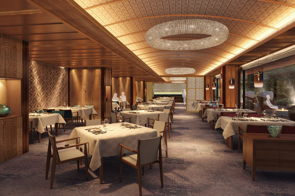 Restaurantは、正面に富士山が展望できる場所にあり、景観を最大限に生かしつつ日本の伝統的な文様や組子、格子、障子などの和のデザインを用いています。天井は片流れの屋根の形状を生かして、緩やかなボールト天井にしています。また、レストラン前面が開放的に開け放たれてテラスデッキと自然の森と一体化するようになっています。