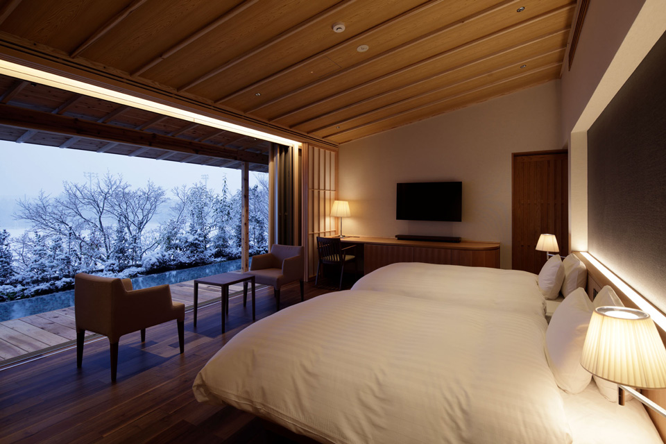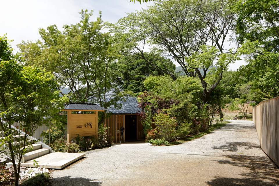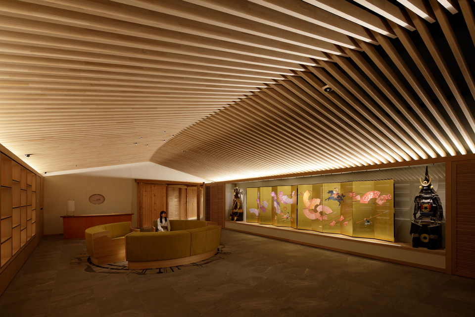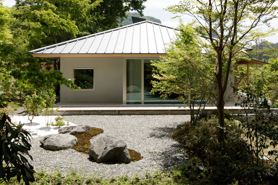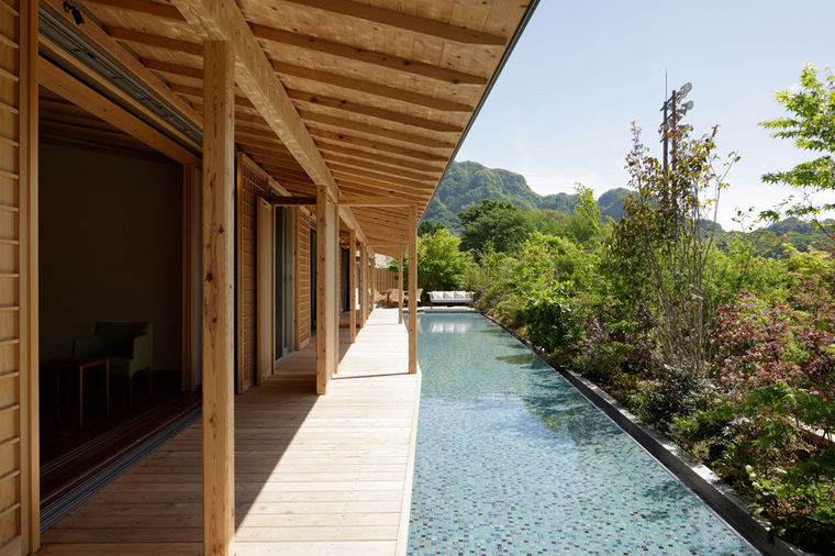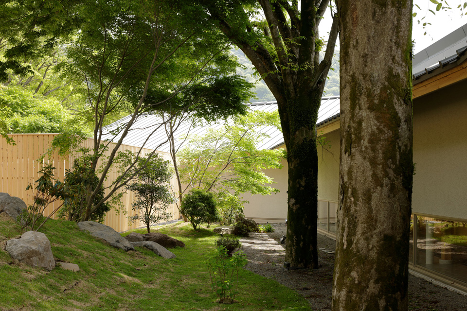 日本の伝統的な建築様式の美の空間を体感できるように、建築の奥性、長い参道、或いは回廊性、独立した柱、水平性、長い庇、居室ー縁側ー水ー庭と、緩やかに内と外を有機的につないだ空間となっています。