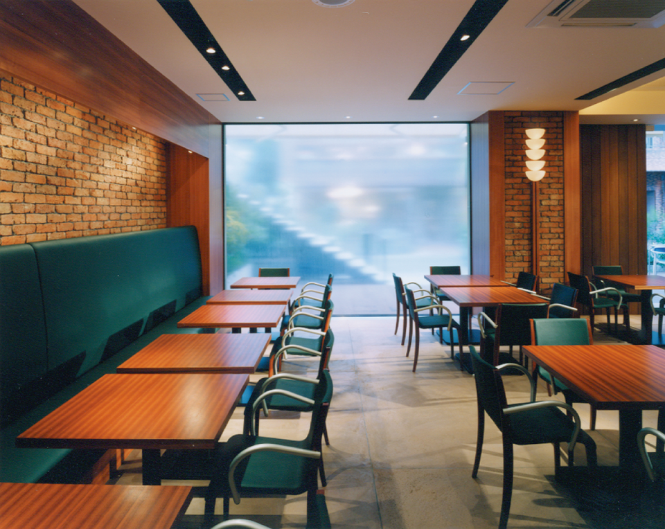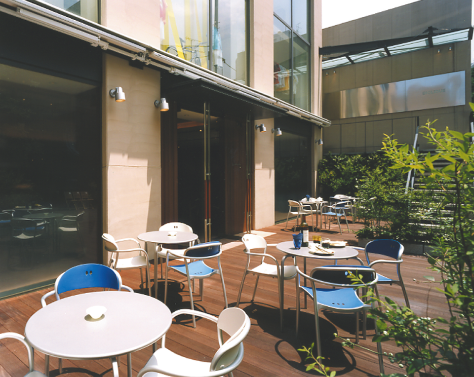 アディングブルーは、南青山の大通りから一本路地裏に入り、緑に囲われたテラスの脇を抜けてエントランスへと向かう。空間は大きく3つの空間に分けられています。反屋外と呼んでもよいテラスデッキは通路に面して緑によって囲い、緩やかに街に対して解放しています。